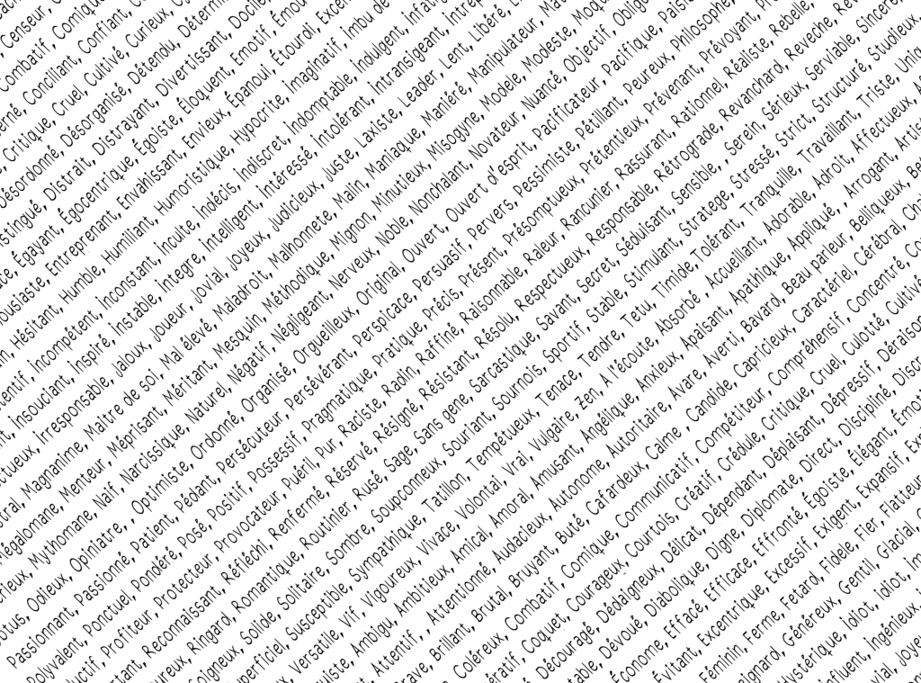 Sur sa vitrine, des mots … Le début d’une liste d’adjectifs permettant de nommer, de définir, dans notre langue, des traits de la personnalité humaine. Ils sont comme des ingrédients dans nos placards, comme des notes sur une partition. Les accords, les proportions et les instruments créent des milliards d’oeuvres uniques et çà … ça me coupe le souffle ! Pas vous ? ^^