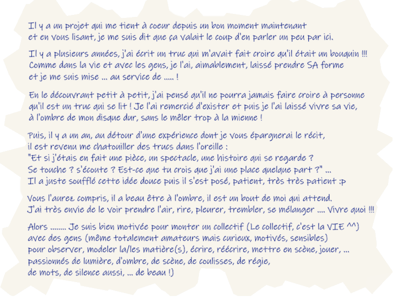 Ce collectif n’est pas créé, le projet non plus. Peut-être qu’il ne sera jamais une oeuvre collective mais mes ingrédients sont prêts, je les bichonne ^^